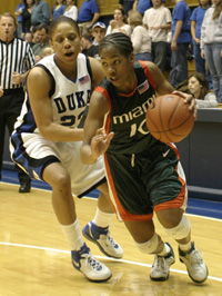 would cripple Miami's offense. Duke attacked her dribble at the top of the key